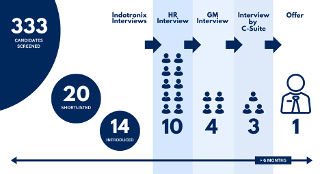 • Multi-Staged Interview Process: As seen in Figure 1, the hiring process took place over several months and multiple stages. Of the hundreds of candidates initially screened, a few were picked to then go through rounds of interviews with the client’s HR representatives, General Managers and finally the executive team from China before an offer was extended and accepted.